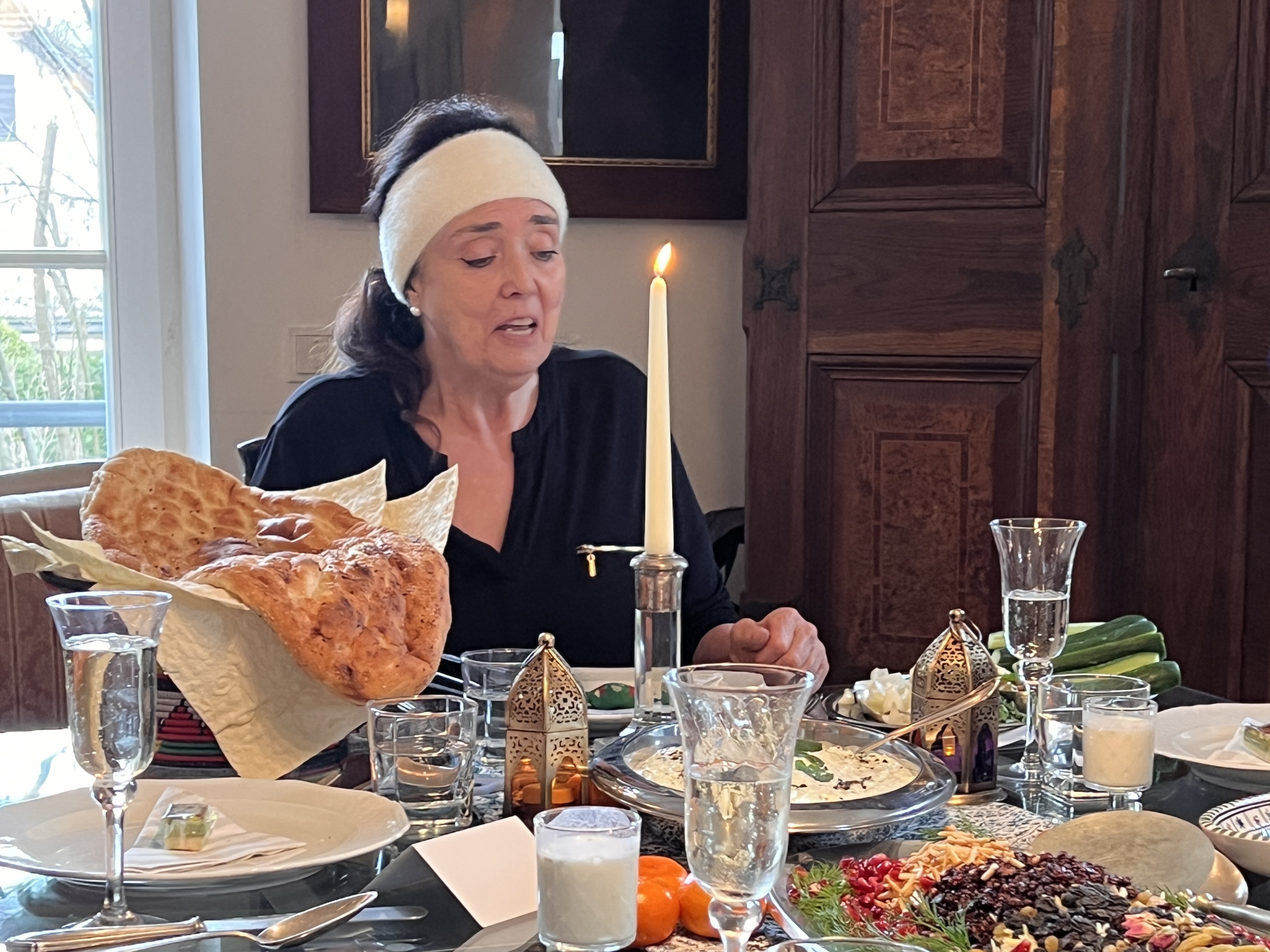 Das Menü spiegelte die Vielfalt und Tradition der persischen Küche wider. Wie in der persischen Kultur üblich, gab es zunächst mehrere große Kräuterplatten mit frischen, aromatischen Kräutern. Besonders beeindruckend war die große Platte mit Basmati-Reis auf Persisch Shirin Polo, was „süßer Reis“ bedeutet. Der Safranreis war mit sehr dünn geschnittenen Orangenschalen, gerösteten ganzen Mandeln, Mandelstiften sowie afghanischen sonnengetrockneten Rosinen und schwarzen  afghanischen auch sonnengetrocknete Rosinen verfeinert. Zusätzlich wurde der Reis mit persischen Zeresch (Berberitzen) und vielen frischen Granatapfelkernen dekoriert, was dem Gericht eine besonders frische und farbenfrohe Optik verlieh. Zum Menü gehörte außerdem ein traditionelles Hähnchengericht mit Walnüssen, Walnusskernen und Granatapfelsirup ohne Zucker zubereitet. Das Gericht wurde etwa vier Stunden lang langsam gekocht, wodurch sich die Aromen besonders intensiv entfalten konnten. Auch persisches Brot durfte nicht fehlen. Serviert wurden sowohl Barbari-Brot als auch Lavash-Brot, zwei klassische Brotsorten der persischen Küche. Ein weiteres Hauptgericht war Kuku Sabzi, ein persisches Eierspeisgericht mit sehr vielen frischen grünen Kräutern, das bei allen Gästen sehr gut ankam.