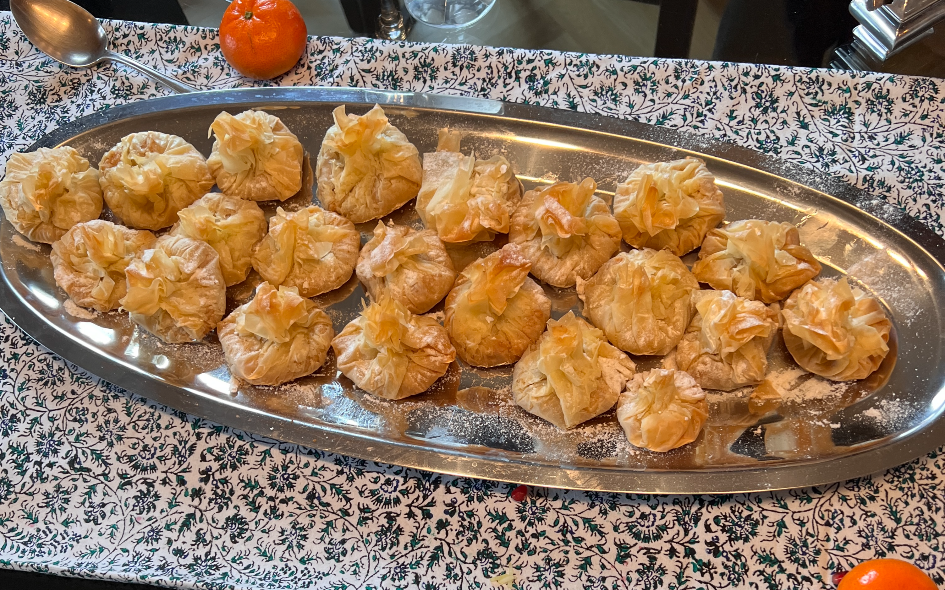 Zum Dessert gab es persische Liebesnestchen, kleine Phylloteigtäschchen, gefüllt mit Mandeln, Orangenblütenwasser, Zucker und Butter. Dazu wurden selbstgemachtes Safran-Eis mit gebrannten Mandeln sowie Himbeereis serviert, alles hausgemacht. Begleitet wurde das Dessert von Sekt, anschließend arabischem Kaffee und Mandarinen ganz nach persischer Tradition.